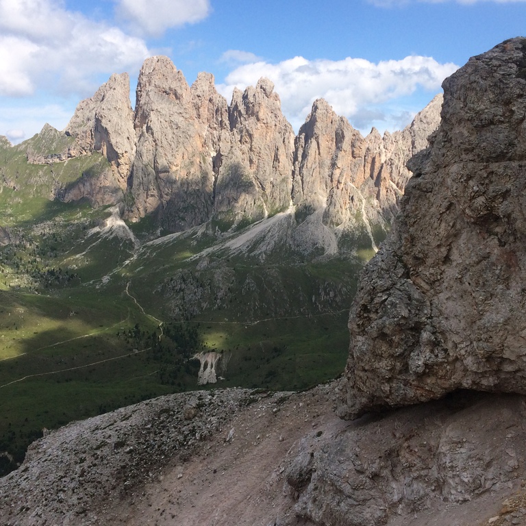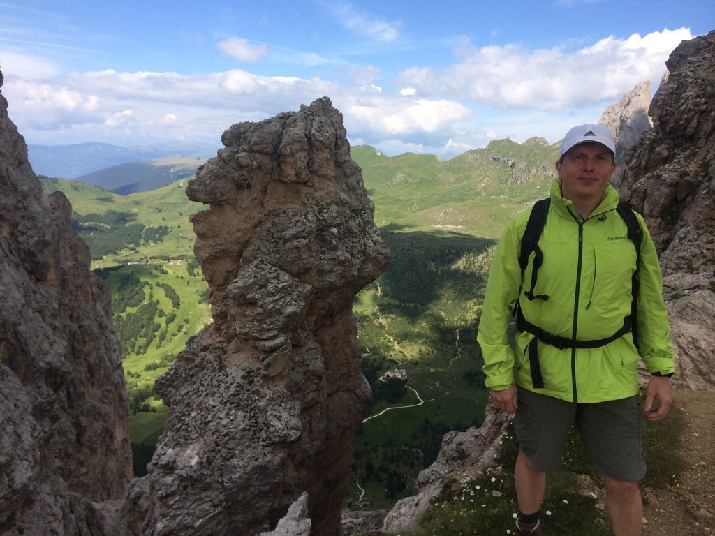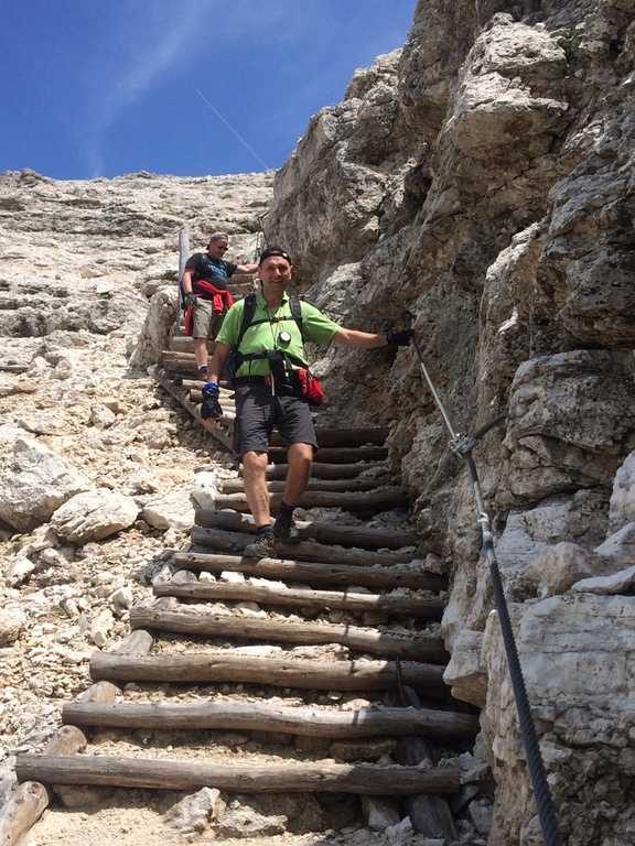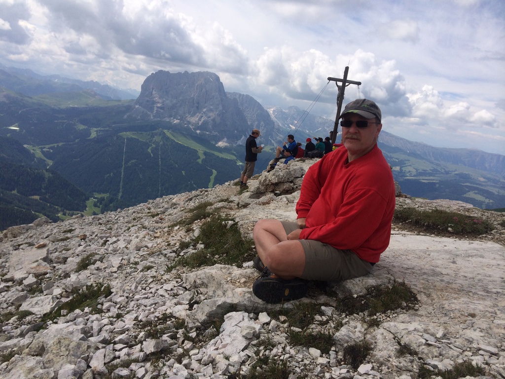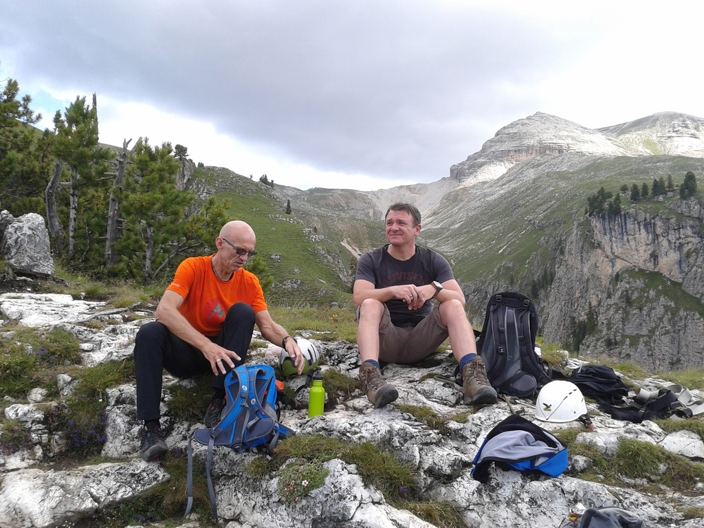 Das war zwar eine Ochserei, trotzdem waren wir noch vor den anderen Jungs am Treffpunkt. Um die Wartezeit zu überbrücken, machten wir dort eine Verpflegungspause und warteten auf die Klettersteig-Geher Uwä und den Ex-Bombes Peter. Als sie in Sichtweite waren, machten sich Jürgen und Charly schon mal auf den Weg in Richtung Gipfel, während der „Alte Mann“ auf die Nachzügler wartete. Über den Grödner Höhenweg ging es dann in gut einer Stunde auf das Gipfelplateau des Col da la Pieres 2.747 m. Dort war es leider ziemlich ungemütlich, denn eine italienische Großfamilie machte den Gipfelbereich zum Hauptbahnhof.