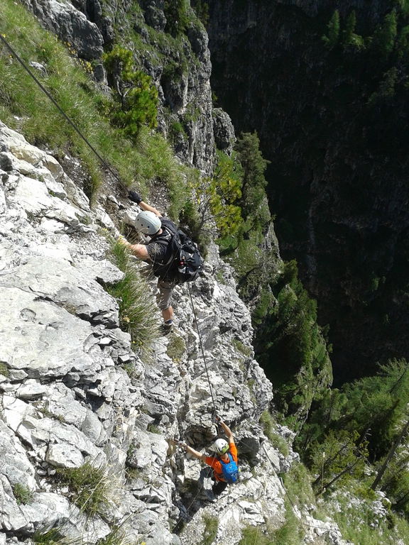 So war es geplant, aber zuerst musste sich Jürgen, der an diesem Morgen als Chauffeur diente, einer Kuhherde beugen. Die befand sich gerade auf ihrem Almauftrieb und ließ kein Fahrzeug mehr durch. So mussten Uwä und der Ex-Bombes doch noch ein Stückchen weiter bis zum Einstieg des Via ferrata Sandro Perini wandern.