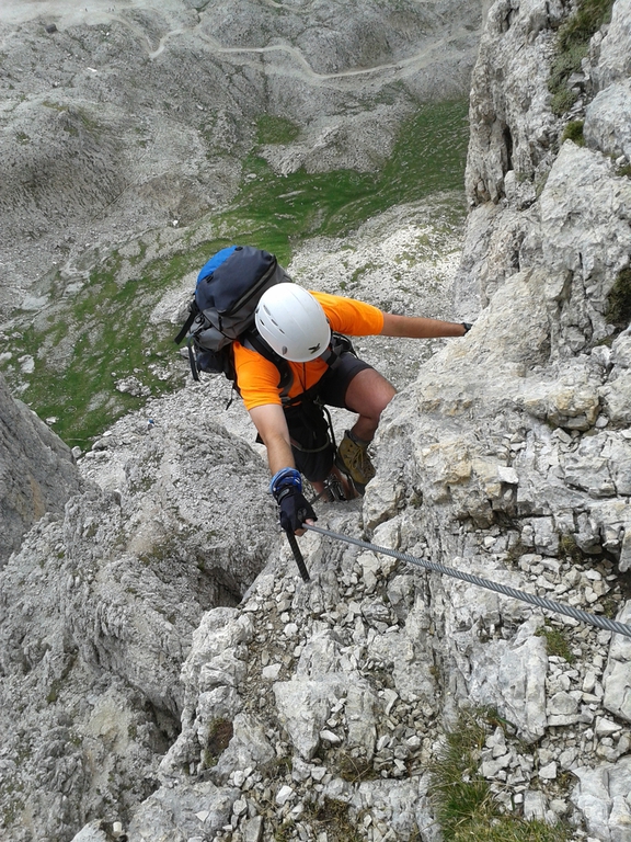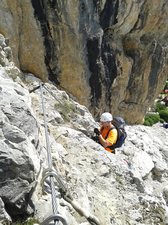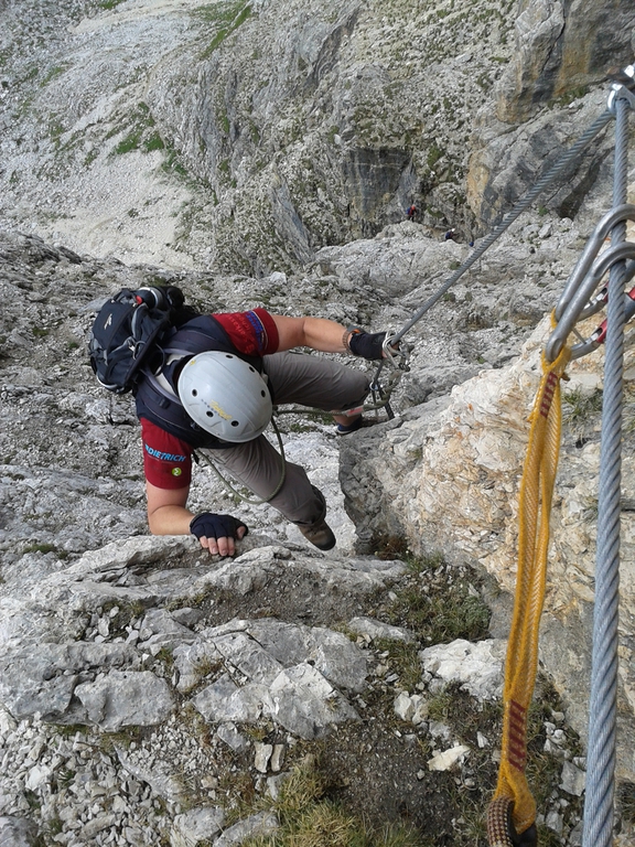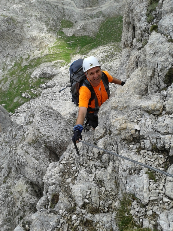 In Corvara brachte uns die Seilbahn Crep du Mont und ein Sesselift zum Ausgangspunkt der Tour. In kurzer Zeit erreichten wir den Einstieg zum Via ferrata Piz da Lec und in schöner, anregender Kletterei ( mit Leitern ) ging es dann zum Gipfel des Boeseekofels 2.916 m. Dort trafen wir auch unsere italienische Rentnertruppe wieder, die über den Normalweg zum Gipfel gekommen war.