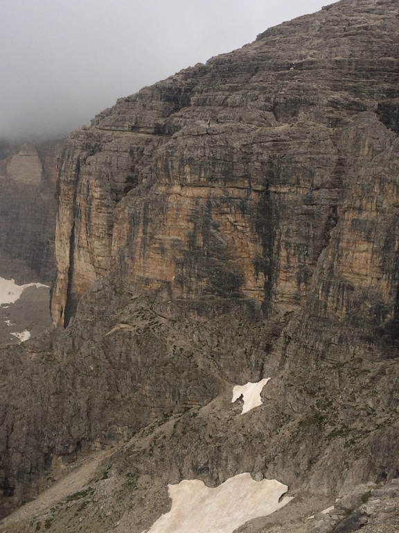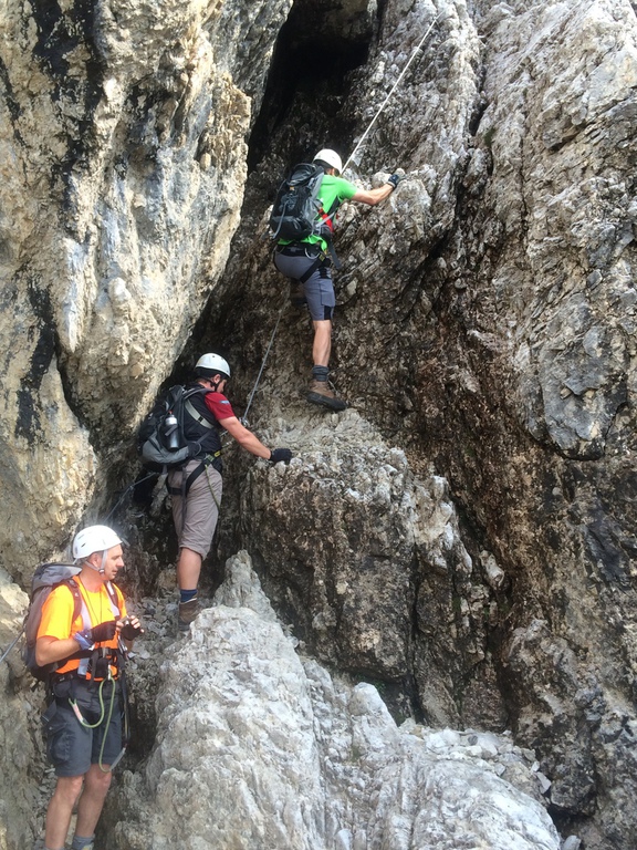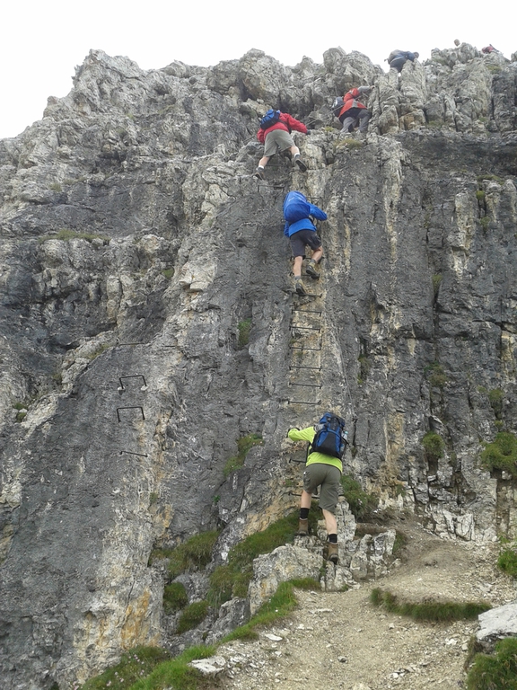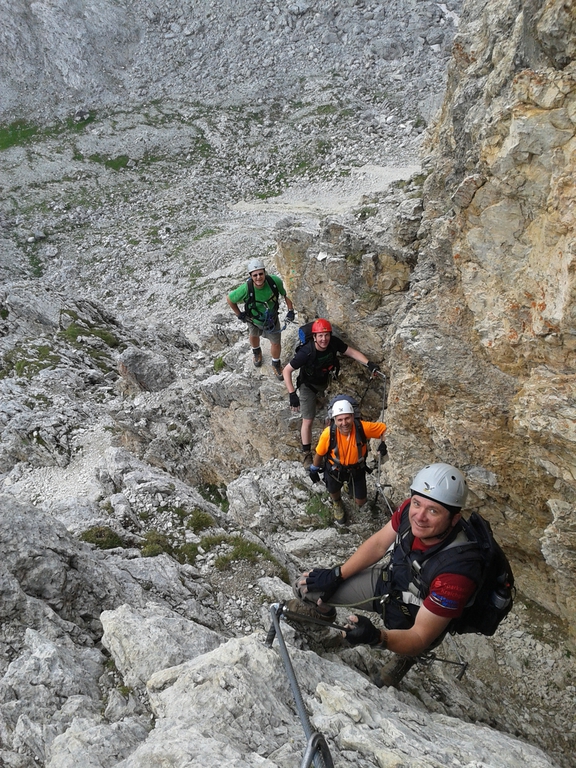 Jetzt war es an der Zeit eine kleine Konversation anzufangen, schließlich erkannten uns die Oldies auch wieder. Der älteste unter ihnen sprach auch relativ gut Deutsch und sagte uns, dass er jetzt 75 Lenze alt sei und den Klettersteig das letzte Mal vor über 20 Jahren gemacht hatte. Inzwischen waren dicke schwarze Wolken herangeflogen, dass Wetter spielte mal wieder Katz und Maus mit uns, denn laut Wetterbericht sollte es erst nachmittags schauern.