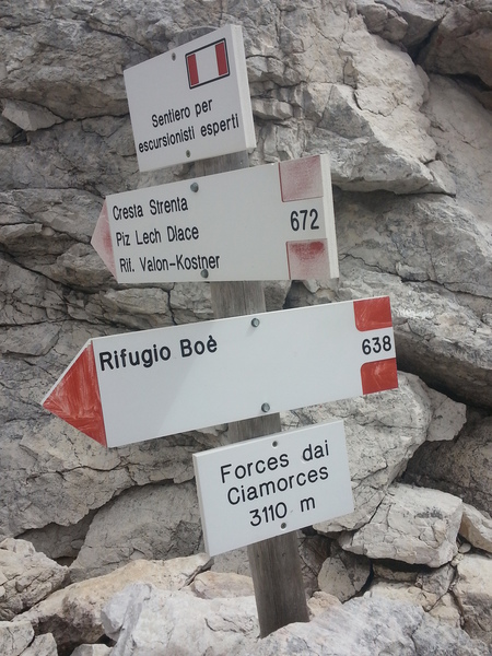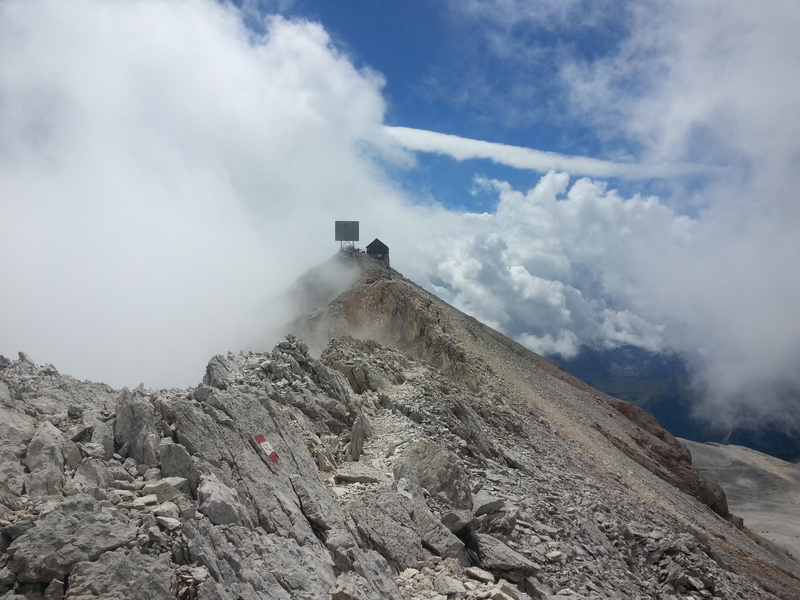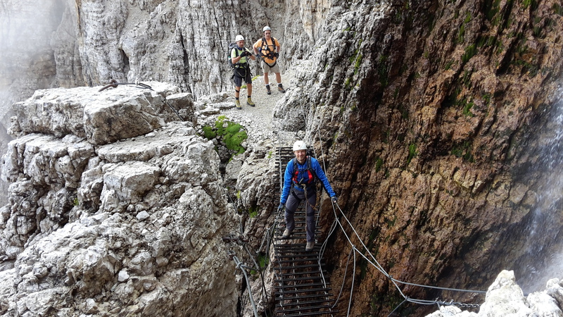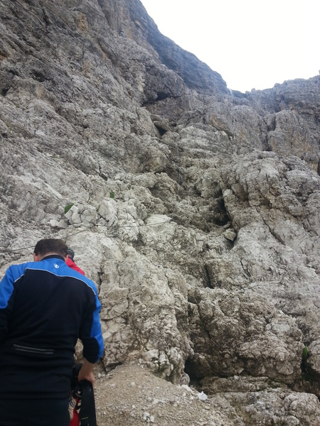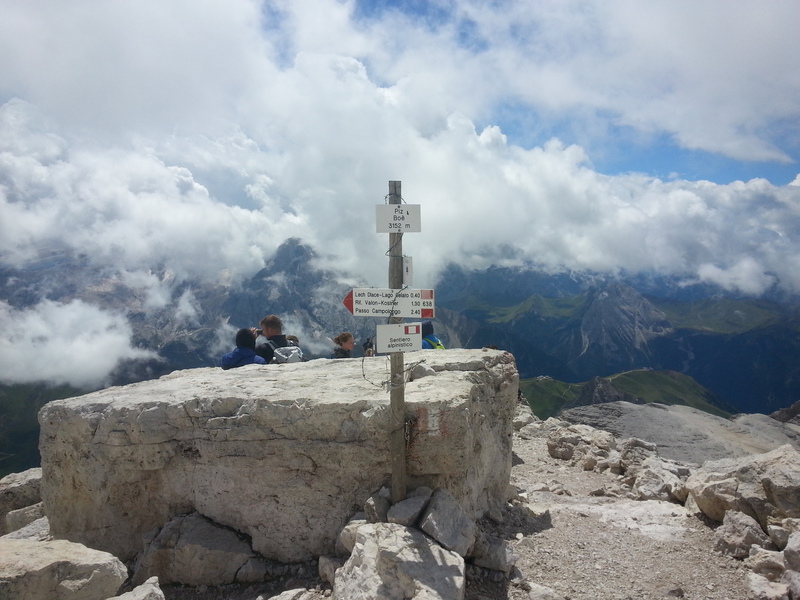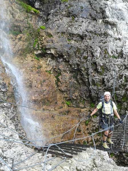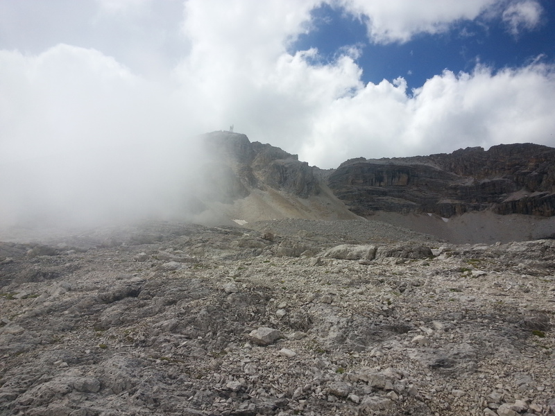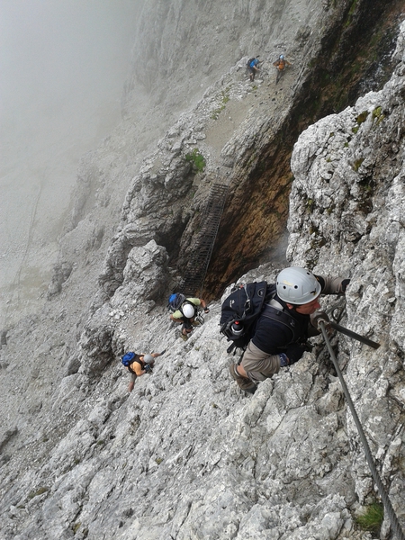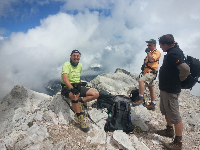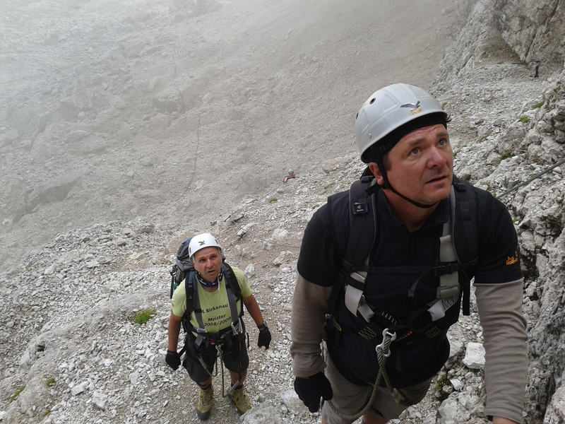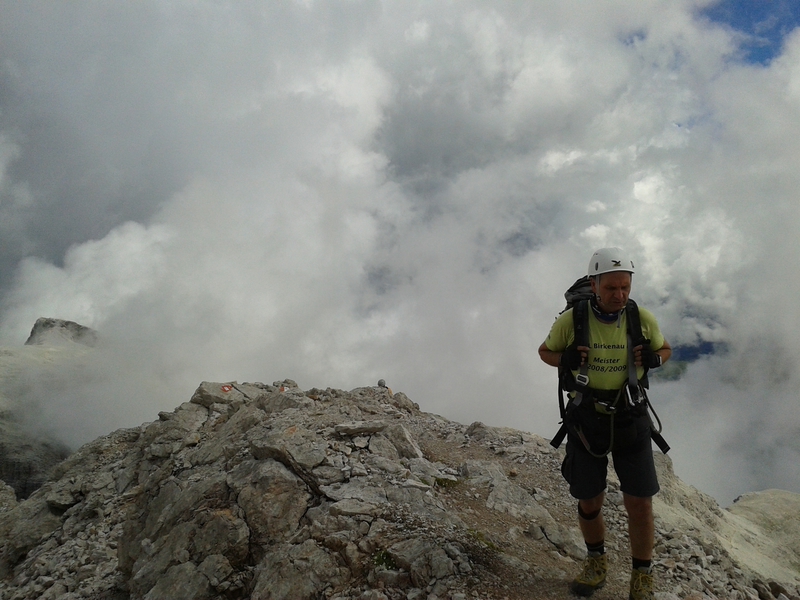 Mit diesen zwei Dreitausendern standen die höchsten Erhebungen dieser Woch auf dem heutigen Programm. Startpunkt der Tour war Corevara 1.522 m im Grödner-Tal, also hieß es ein weiteres Mal das Grödner-Joch 2.121 m rauf und runter ins Val Badia. Mit der Seilbahn Crep du Mont und dem Sessellift ließen wir uns erstmal auf 2.537 m tragen, bevor wir uns auch heute wieder in den Nebel auf dem Plan de Sass stürzten. Es herrschte eine gespenstige Ruhe, dass hatte natürlich mit der unsicheren Wetterlage zu tun und so waren wir fast alleine unterwegs. Nur hinter uns befand sich noch ein älteres, aber recht fittes Ehepaar im Anmarsch zum Steig, auf das wir noch später im Bericht zurück kommen werden. Umringt vom Boeseekofel, Zehner, Neuner und dem Piz di Valun erreichten wir den Einsteig des Vallon-Klettersteiges. In schöner Kletterei arbeiteten wir uns dann zur Schlüsselstelle an einem Wasserfall vor. Eine ziemlich wackelige Angelegenheit war die Überquerung einer kleinen Hängebrücke direkt vor dem Wasserfall, bevor es dann knapp 50 m fast senkrecht nach oben ging. Nach dem Ausstieg erreichten wir eine Hochebene und passierten kurze Zeit später den Lago Gelato 2.833 m, an dem das dahinter liegende alte Schneefeld die Form eines Fisches hatte. Weiter ging es zur Eisseespitze 3.009 m, auf der alte Erinnerungen an unsere Jugendzeiten in den Dolomiten wach wurden. Das letzte Hindernis vor der Boe-Spitze 3.152 m war die Forces dai Ciamorces 3.110 m, ein paar Minuten später erreichten wir die Fassa-Hütte am Gipfel des Piz Boe. Nach einer kleinen Trinkpause traten wir den Rückweg an, der schließlich für einen in ziemlich schreck- und schmerzhafter Erinnerung blieb. Zuerst war es ein harmloser Geröllsteig, der in steilen Serpentinen abwärts führte, bis wir eine steile Schlucht passieren mussten. Dort geriet ein ziemlich großer und schwerer Felsbrocken ins Rutschen und begrub die linke Fußspitze des Waldhof-Bubes unter sich. Da der Uwä und der Ex-Bombes sich schon außerhalb der Rufweite befanden, waren wir auf fremde Hilfe angewiesen. Zum Glück bog unser Ehepaar von heute Vormittag gerade um die Ecke, denn zu zweit konnten wir den Fels nicht von der Stelle bewegen, zudem drohte er noch mehr auf den Fuß zu rutschen. Zu dritt hoben wir dann den Brocken für einen kurzen Augenblick an, so dass ich den Fuß wegziehen konnte. Ein großes Dankeschön ging gleich danach an den freundlichen Helfer, sowie an den Schuhausrüster Hanwag, dessen Robustheit einen Zehenbruch verhinderte. So blieben nur der Schreck und drei geprellte Zehen übrig und wir konnten an der Franz-Kostner-Hütte zu den anderen beiden aufschließen. Mit dem Lift bzw. danach der Bahn ging es dann nach Corvara hinunter und anschließend zwischen Colfosco und dem Grödner-Joch zum Abendessen.