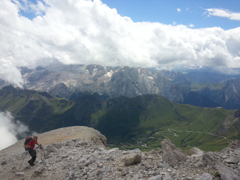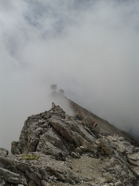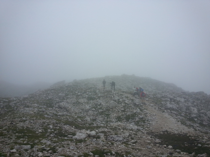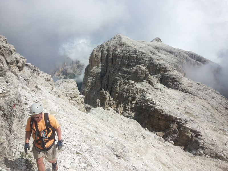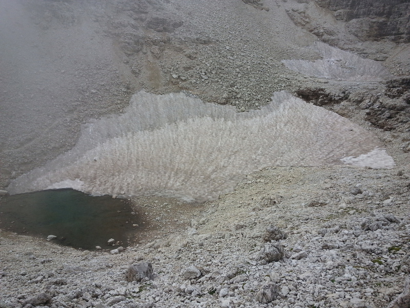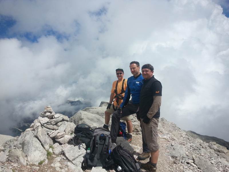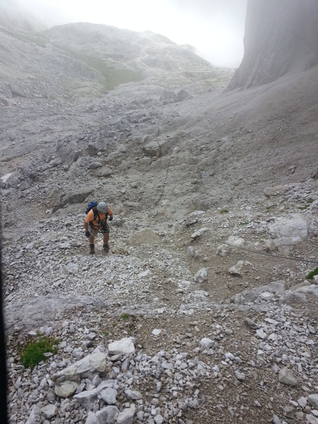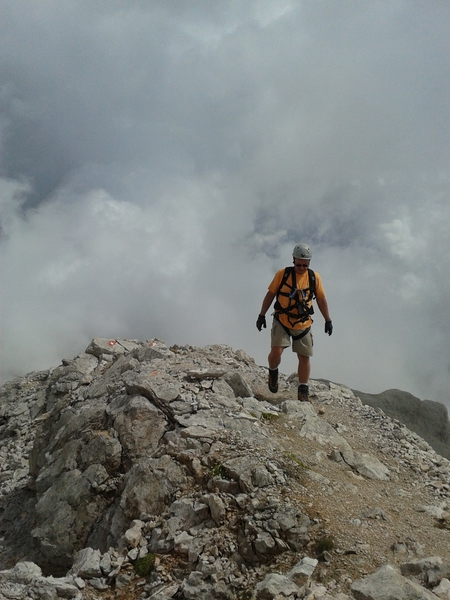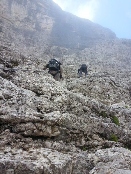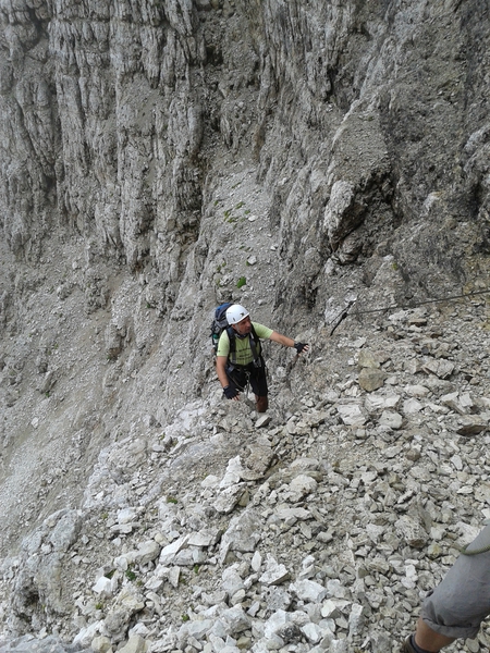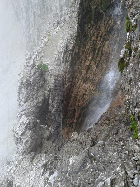 Mit diesen zwei Dreitausendern standen die höchsten Erhebungen dieser Woch auf dem heutigen Programm. Startpunkt der Tour war Corevara 1.522 m im Grödner-Tal, also hieß es ein weiteres Mal das Grödner-Joch 2.121 m rauf und runter ins Val Badia. Mit der Seilbahn Crep du Mont und dem Sessellift ließen wir uns erstmal auf 2.537 m tragen, bevor wir uns auch heute wieder in den Nebel auf dem Plan de Sass stürzten. Es herrschte eine gespenstige Ruhe, dass hatte natürlich mit der unsicheren Wetterlage zu tun und so waren wir fast alleine unterwegs. Nur hinter uns befand sich noch ein älteres, aber recht fittes Ehepaar im Anmarsch zum Steig, auf das wir noch später im Bericht zurück kommen werden. Umringt vom Boeseekofel, Zehner, Neuner und dem Piz di Valun erreichten wir den Einsteig des Vallon-Klettersteiges. In schöner Kletterei arbeiteten wir uns dann zur Schlüsselstelle an einem Wasserfall vor. Eine ziemlich wackelige Angelegenheit war die Überquerung einer kleinen Hängebrücke direkt vor dem Wasserfall, bevor es dann knapp 50 m fast senkrecht nach oben ging. Nach dem Ausstieg erreichten wir eine Hochebene und passierten kurze Zeit später den Lago Gelato 2.833 m, an dem das dahinter liegende alte Schneefeld die Form eines Fisches hatte. Weiter ging es zur Eisseespitze 3.009 m, auf der alte Erinnerungen an unsere Jugendzeiten in den Dolomiten wach wurden. Das letzte Hindernis vor der Boe-Spitze 3.152 m war die Forces dai Ciamorces 3.110 m, ein paar Minuten später erreichten wir die Fassa-Hütte am Gipfel des Piz Boe. Nach einer kleinen Trinkpause traten wir den Rückweg an, der schließlich für einen in ziemlich schreck- und schmerzhafter Erinnerung blieb. Zuerst war es ein harmloser Geröllsteig, der in steilen Serpentinen abwärts führte, bis wir eine steile Schlucht passieren mussten. Dort geriet ein ziemlich großer und schwerer Felsbrocken ins Rutschen und begrub die linke Fußspitze des Waldhof-Bubes unter sich. Da der Uwä und der Ex-Bombes sich schon außerhalb der Rufweite befanden, waren wir auf fremde Hilfe angewiesen. Zum Glück bog unser Ehepaar von heute Vormittag gerade um die Ecke, denn zu zweit konnten wir den Fels nicht von der Stelle bewegen, zudem drohte er noch mehr auf den Fuß zu rutschen. Zu dritt hoben wir dann den Brocken für einen kurzen Augenblick an, so dass ich den Fuß wegziehen konnte. Ein großes Dankeschön ging gleich danach an den freundlichen Helfer, sowie an den Schuhausrüster Hanwag, dessen Robustheit einen Zehenbruch verhinderte. So blieben nur der Schreck und drei geprellte Zehen übrig und wir konnten an der Franz-Kostner-Hütte zu den anderen beiden aufschließen. Mit dem Lift bzw. danach der Bahn ging es dann nach Corvara hinunter und anschließend zwischen Colfosco und dem Grödner-Joch zum Abendessen.