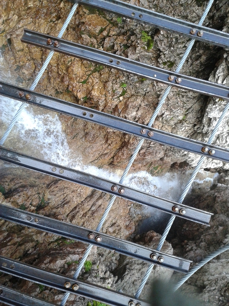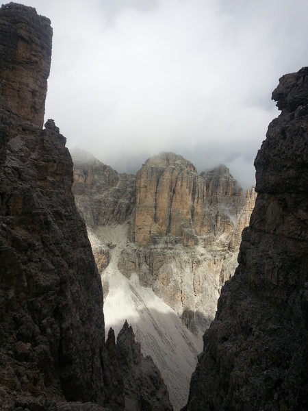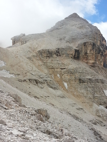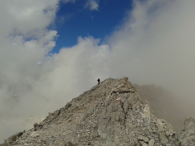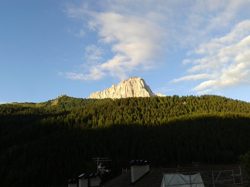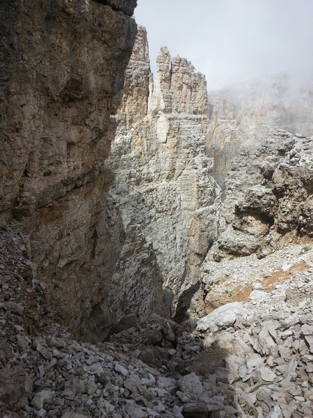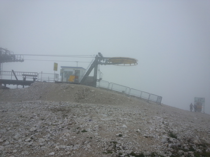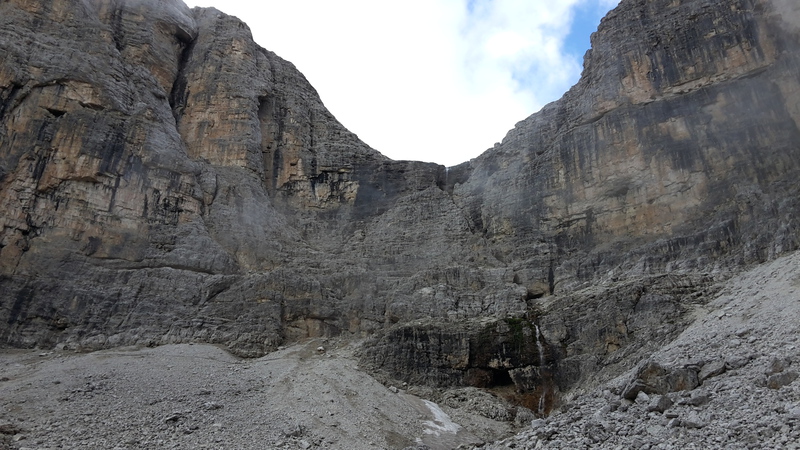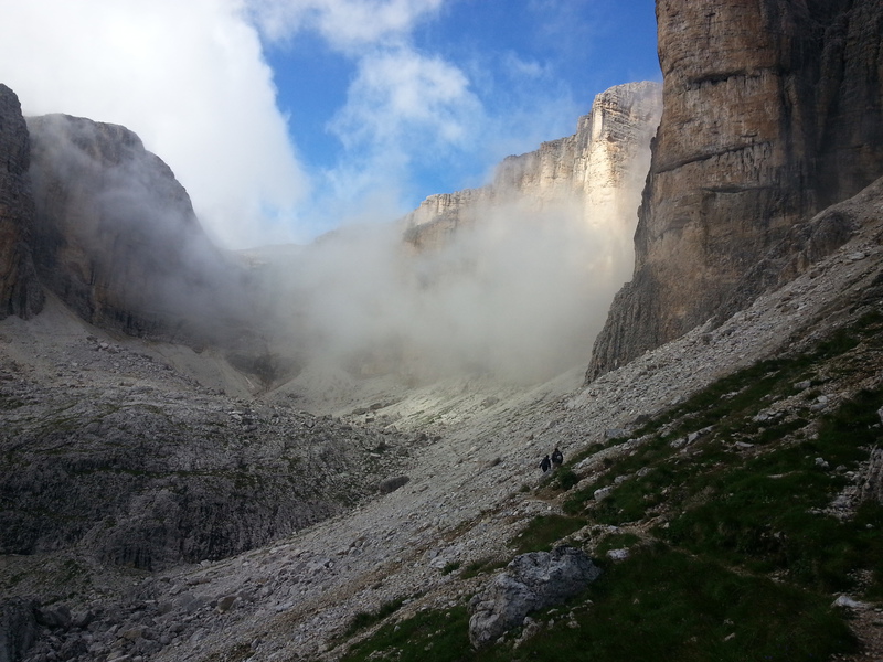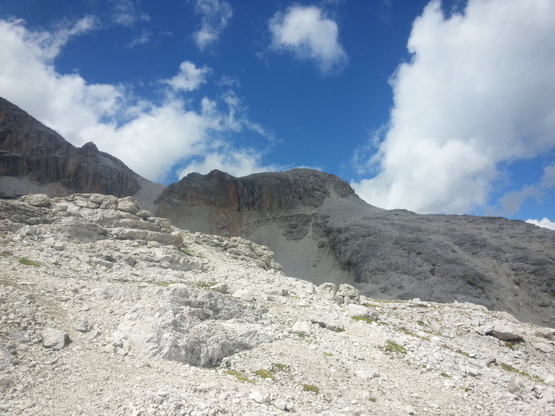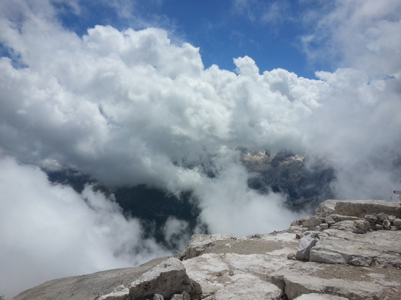 Mit diesen zwei Dreitausendern standen die höchsten Erhebungen dieser Woch auf dem heutigen Programm. Startpunkt der Tour war Corevara 1.522 m im Grödner-Tal, also hieß es ein weiteres Mal das Grödner-Joch 2.121 m rauf und runter ins Val Badia. Mit der Seilbahn Crep du Mont und dem Sessellift ließen wir uns erstmal auf 2.537 m tragen, bevor wir uns auch heute wieder in den Nebel auf dem Plan de Sass stürzten. Es herrschte eine gespenstige Ruhe, dass hatte natürlich mit der unsicheren Wetterlage zu tun und so waren wir fast alleine unterwegs. Nur hinter uns befand sich noch ein älteres, aber recht fittes Ehepaar im Anmarsch zum Steig, auf das wir noch später im Bericht zurück kommen werden. Umringt vom Boeseekofel, Zehner, Neuner und dem Piz di Valun erreichten wir den Einsteig des Vallon-Klettersteiges. In schöner Kletterei arbeiteten wir uns dann zur Schlüsselstelle an einem Wasserfall vor. Eine ziemlich wackelige Angelegenheit war die Überquerung einer kleinen Hängebrücke direkt vor dem Wasserfall, bevor es dann knapp 50 m fast senkrecht nach oben ging. Nach dem Ausstieg erreichten wir eine Hochebene und passierten kurze Zeit später den Lago Gelato 2.833 m, an dem das dahinter liegende alte Schneefeld die Form eines Fisches hatte. Weiter ging es zur Eisseespitze 3.009 m, auf der alte Erinnerungen an unsere Jugendzeiten in den Dolomiten wach wurden. Das letzte Hindernis vor der Boe-Spitze 3.152 m war die Forces dai Ciamorces 3.110 m, ein paar Minuten später erreichten wir die Fassa-Hütte am Gipfel des Piz Boe. Nach einer kleinen Trinkpause traten wir den Rückweg an, der schließlich für einen in ziemlich schreck- und schmerzhafter Erinnerung blieb. Zuerst war es ein harmloser Geröllsteig, der in steilen Serpentinen abwärts führte, bis wir eine steile Schlucht passieren mussten. Dort geriet ein ziemlich großer und schwerer Felsbrocken ins Rutschen und begrub die linke Fußspitze des Waldhof-Bubes unter sich. Da der Uwä und der Ex-Bombes sich schon außerhalb der Rufweite befanden, waren wir auf fremde Hilfe angewiesen. Zum Glück bog unser Ehepaar von heute Vormittag gerade um die Ecke, denn zu zweit konnten wir den Fels nicht von der Stelle bewegen, zudem drohte er noch mehr auf den Fuß zu rutschen. Zu dritt hoben wir dann den Brocken für einen kurzen Augenblick an, so dass ich den Fuß wegziehen konnte. Ein großes Dankeschön ging gleich danach an den freundlichen Helfer, sowie an den Schuhausrüster Hanwag, dessen Robustheit einen Zehenbruch verhinderte. So blieben nur der Schreck und drei geprellte Zehen übrig und wir konnten an der Franz-Kostner-Hütte zu den anderen beiden aufschließen. Mit dem Lift bzw. danach der Bahn ging es dann nach Corvara hinunter und anschließend zwischen Colfosco und dem Grödner-Joch zum Abendessen.