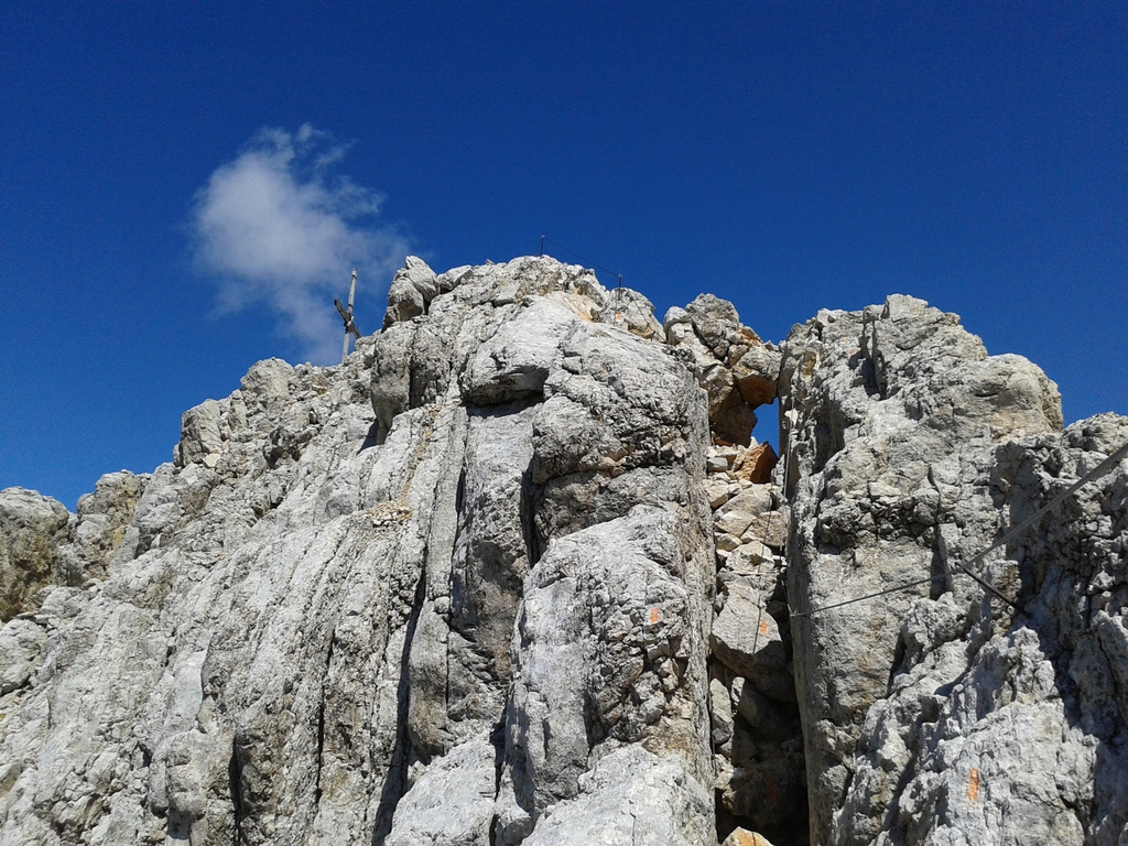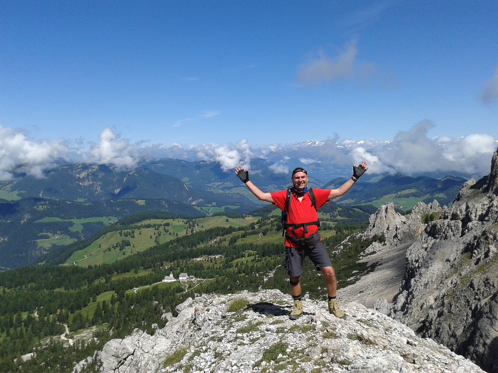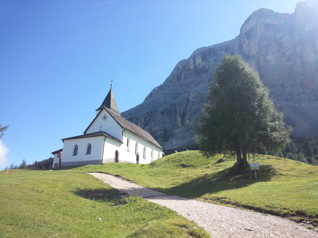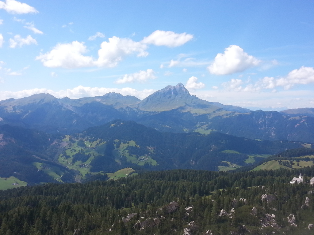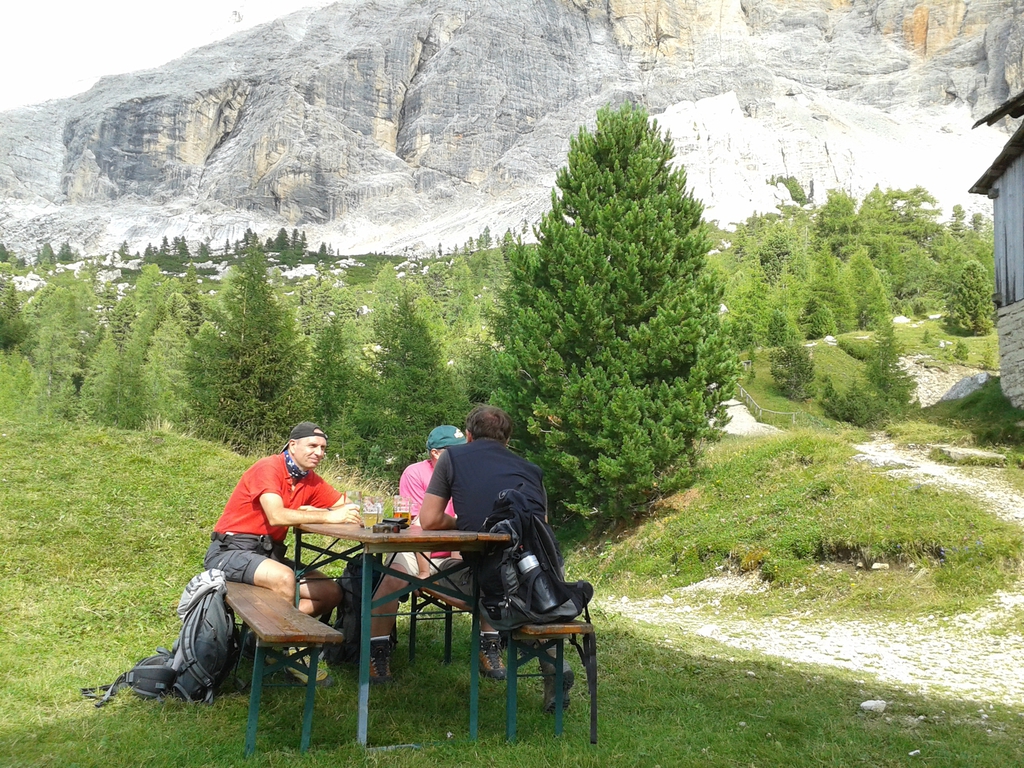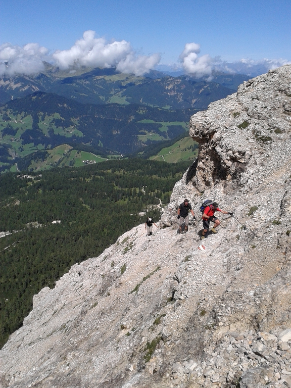 Zum Abschluss unserer Tourenwoche hatten wir uns die Fanesgruppe mit den beiden Gipfeln Heiligkreuzkofel 2.907 m und Zehnerspitze 3.026 m ausgesucht. Auch diese Tour stand ja schon letztes Jahr auf unserem Planer, aber das Wetter hatte uns damals einen Strich durch die Rechnung gemacht. So traten wir heuer bei Bilderbuchwetter die lange Fahrt über das Grödner-Joch 2.121 m nach Colfosco und durch das gesamte Val Badia ( Gadertal ) bis Pedratsches 1.324 m an. Dort stiegen wir in den Sessellift „Santa Croce“ , der uns auf eine Höhe von 1.840 m brachte. Von der Bergstation weg orientierten wir uns am „Kreuzgang“ hin zum Wallfahrtsort Heiligkreuz mit Kapelle und Gasthaus 2.045 m. Dort oben hatten wir einen sensationellen Blick auf die von tiefliegenden Schönwetterwolken umrahmte Puez-Gruppe. Jetzt ging es durch Latschen und Geröll zum Einstieg, an dem uns der Charly kurz vorher in Richtung Gasthaus verließ. In leichter Kletterei ging es hinauf zur Kreuzkofelscharte 2.612 m und auf die Hochebene von Fanes. Jetzt sahen wir schon die beiden Gipfel der Kreuzofelgruppe, allerdings noch in weiter Entfernung. Entlang der Westabstürze erreichten wir über Schuttablagerungen das große Holzkreuz des Heiligkreuzkofels 2.907 m. Nach einer kurzen Pause traten dann der Uwä und der Waldhof-Bub den Heimweg zu Charly an, zu verlockend war doch die Aussicht auf ein baldiges, kühles Getränk. Der Ex-Bombes zeigte sich derweilen ehrgeizig und bestieg noch alleine die Zehnerspitze 3.026 m. Die Vermutung lag nahe, dass er ja nur wegen seiner Caches noch hoch wollte. Am Heiligkreuzhospiz trafen wir uns schließlich alle wieder zum gemütlichen Abschluss, ehe die Rückfahrt nach Wolkenstein erfolgte.