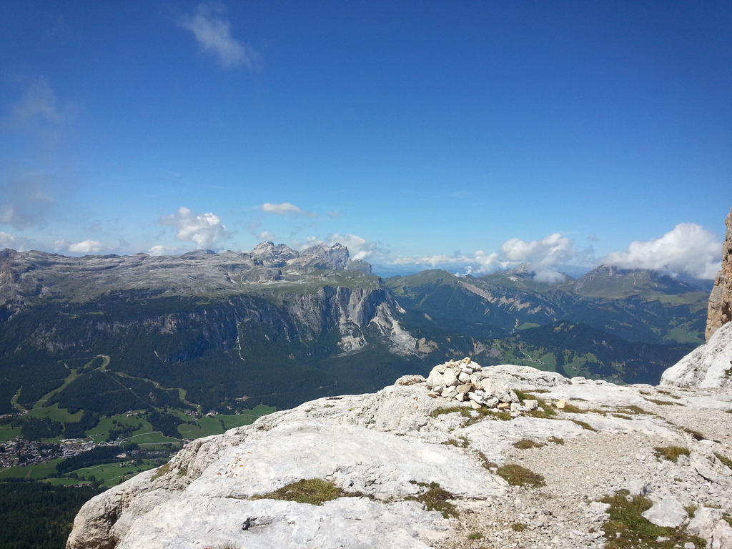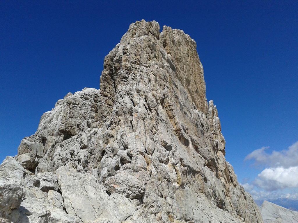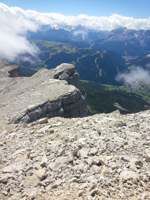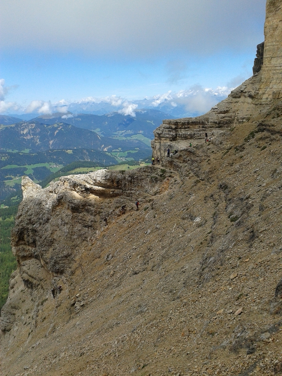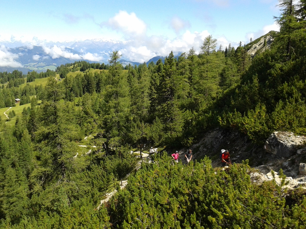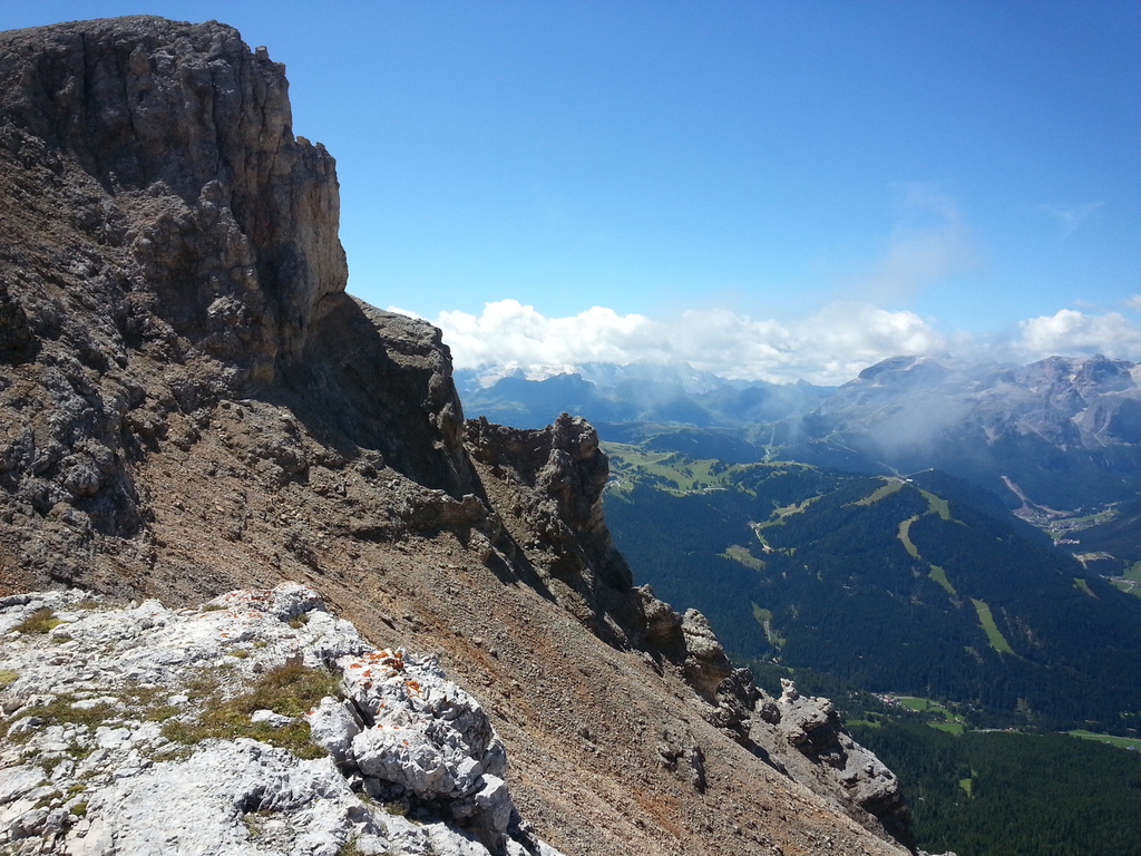 Zum Abschluss unserer Tourenwoche hatten wir uns die Fanesgruppe mit den beiden Gipfeln Heiligkreuzkofel 2.907 m und Zehnerspitze 3.026 m ausgesucht. Auch diese Tour stand ja schon letztes Jahr auf unserem Planer, aber das Wetter hatte uns damals einen Strich durch die Rechnung gemacht. So traten wir heuer bei Bilderbuchwetter die lange Fahrt über das Grödner-Joch 2.121 m nach Colfosco und durch das gesamte Val Badia ( Gadertal ) bis Pedratsches 1.324 m an. Dort stiegen wir in den Sessellift „Santa Croce“ , der uns auf eine Höhe von 1.840 m brachte. Von der Bergstation weg orientierten wir uns am „Kreuzgang“ hin zum Wallfahrtsort Heiligkreuz mit Kapelle und Gasthaus 2.045 m. Dort oben hatten wir einen sensationellen Blick auf die von tiefliegenden Schönwetterwolken umrahmte Puez-Gruppe. Jetzt ging es durch Latschen und Geröll zum Einstieg, an dem uns der Charly kurz vorher in Richtung Gasthaus verließ. In leichter Kletterei ging es hinauf zur Kreuzkofelscharte 2.612 m und auf die Hochebene von Fanes. Jetzt sahen wir schon die beiden Gipfel der Kreuzofelgruppe, allerdings noch in weiter Entfernung. Entlang der Westabstürze erreichten wir über Schuttablagerungen das große Holzkreuz des Heiligkreuzkofels 2.907 m. Nach einer kurzen Pause traten dann der Uwä und der Waldhof-Bub den Heimweg zu Charly an, zu verlockend war doch die Aussicht auf ein baldiges, kühles Getränk. Der Ex-Bombes zeigte sich derweilen ehrgeizig und bestieg noch alleine die Zehnerspitze 3.026 m. Die Vermutung lag nahe, dass er ja nur wegen seiner Caches noch hoch wollte. Am Heiligkreuzhospiz trafen wir uns schließlich alle wieder zum gemütlichen Abschluss, ehe die Rückfahrt nach Wolkenstein erfolgte.