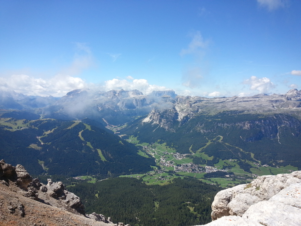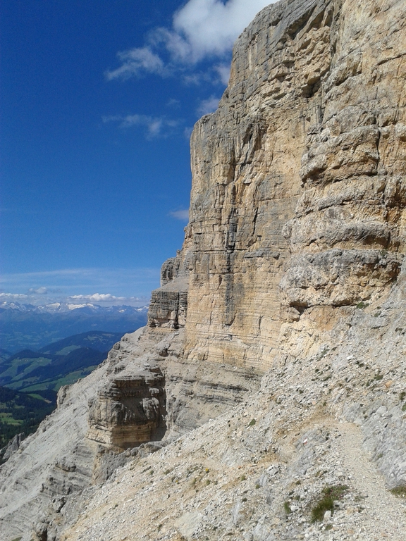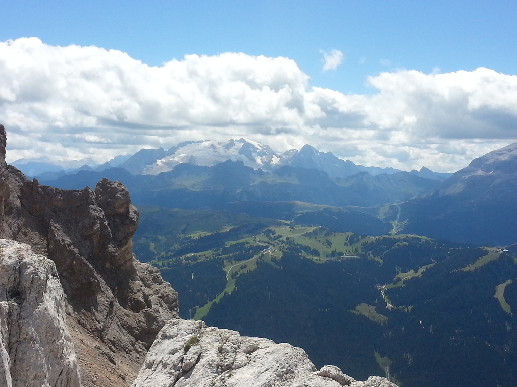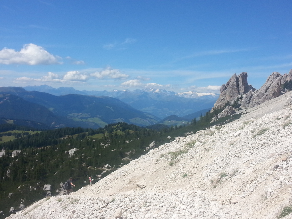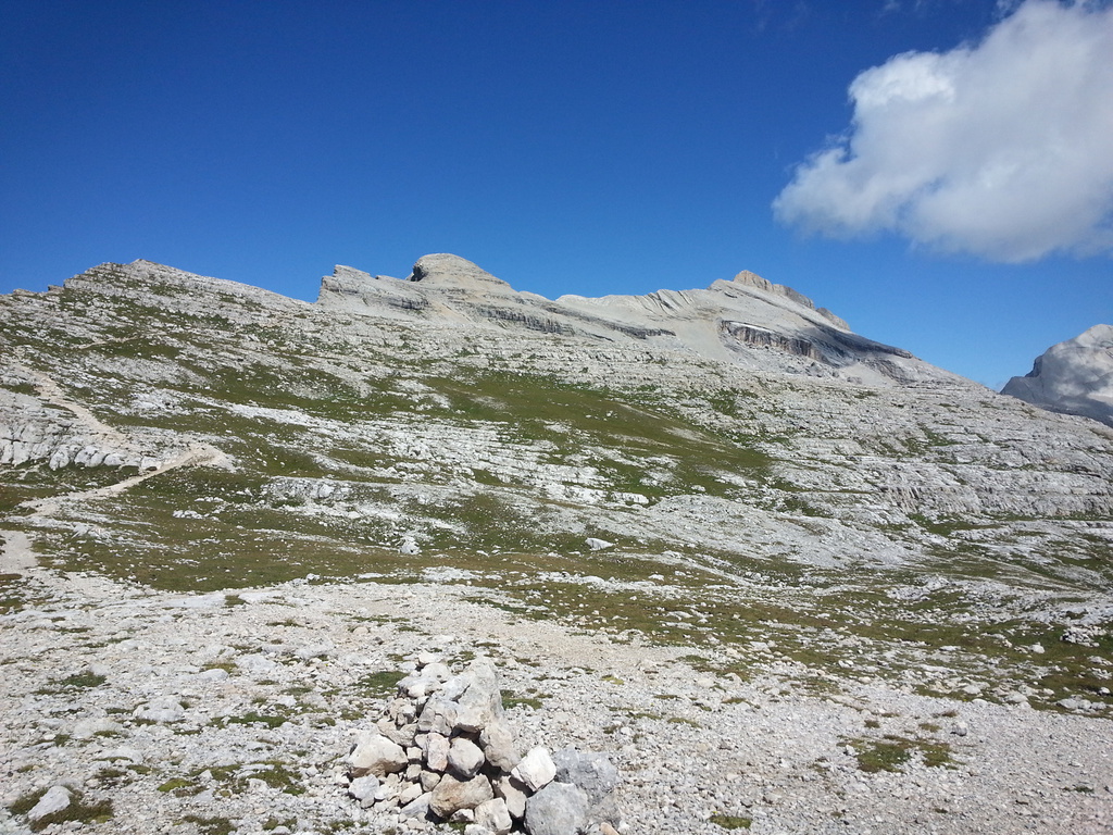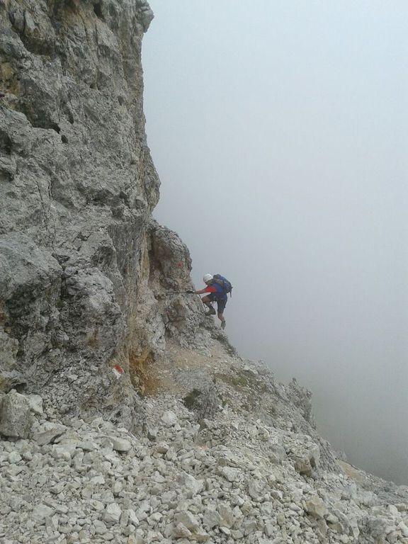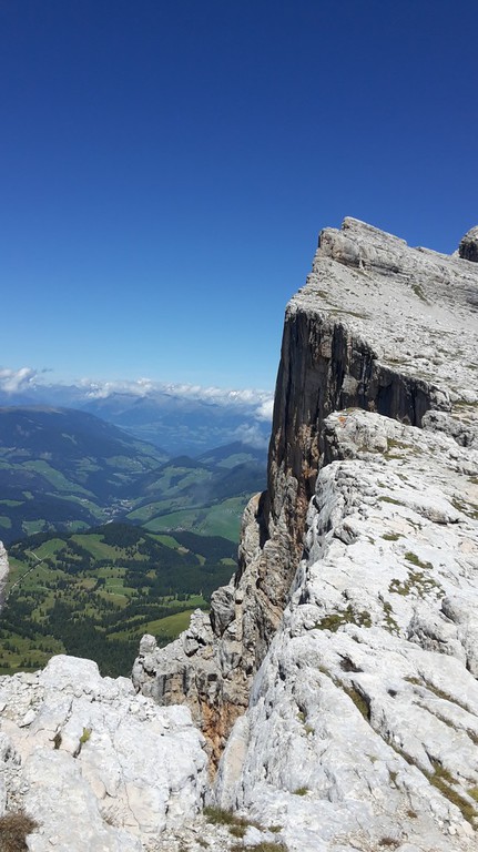 Zum Abschluss unserer Tourenwoche hatten wir uns die Fanesgruppe mit den beiden Gipfeln Heiligkreuzkofel 2.907 m und Zehnerspitze 3.026 m ausgesucht. Auch diese Tour stand ja schon letztes Jahr auf unserem Planer, aber das Wetter hatte uns damals einen Strich durch die Rechnung gemacht. So traten wir heuer bei Bilderbuchwetter die lange Fahrt über das Grödner-Joch 2.121 m nach Colfosco und durch das gesamte Val Badia ( Gadertal ) bis Pedratsches 1.324 m an. Dort stiegen wir in den Sessellift „Santa Croce“ , der uns auf eine Höhe von 1.840 m brachte. Von der Bergstation weg orientierten wir uns am „Kreuzgang“ hin zum Wallfahrtsort Heiligkreuz mit Kapelle und Gasthaus 2.045 m. Dort oben hatten wir einen sensationellen Blick auf die von tiefliegenden Schönwetterwolken umrahmte Puez-Gruppe. Jetzt ging es durch Latschen und Geröll zum Einstieg, an dem uns der Charly kurz vorher in Richtung Gasthaus verließ. In leichter Kletterei ging es hinauf zur Kreuzkofelscharte 2.612 m und auf die Hochebene von Fanes. Jetzt sahen wir schon die beiden Gipfel der Kreuzofelgruppe, allerdings noch in weiter Entfernung. Entlang der Westabstürze erreichten wir über Schuttablagerungen das große Holzkreuz des Heiligkreuzkofels 2.907 m. Nach einer kurzen Pause traten dann der Uwä und der Waldhof-Bub den Heimweg zu Charly an, zu verlockend war doch die Aussicht auf ein baldiges, kühles Getränk. Der Ex-Bombes zeigte sich derweilen ehrgeizig und bestieg noch alleine die Zehnerspitze 3.026 m. Die Vermutung lag nahe, dass er ja nur wegen seiner Caches noch hoch wollte. Am Heiligkreuzhospiz trafen wir uns schließlich alle wieder zum gemütlichen Abschluss, ehe die Rückfahrt nach Wolkenstein erfolgte.