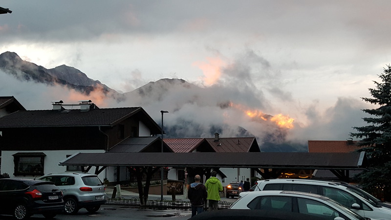 Nach einem ausgiebigen Frühstück, mussten wir erst einmal warten und warten und warten, bis Petrus endlich ein Einsehen hatte und uns ein kurzes Wetterfenster schenkte. Um die Mittagszeit hörte dann der Regen für gute drei Stunden auf und wir fuhren zur Talstation der Zugspitzbahn. Von dort aus wanderten wir im dichten Nebel zur Hochthörle Hütte 1.479 m, kehrten dort ein und genossen die Köstlichkeiten Tirols. Gerade noch rechtzeitig traten wir den Rückzug an, denn auf den letzten Metern fing es an zu schütten. Alles richtig gemacht, denn der Regen und das darauf folgende Gewitter hielten uns dann bis zum Abendessen in Schach. Erst dann öffnete sich die Wolkendecke und bescherte uns ein sensationelles Bild auf die „Berge in Flammen“. So langsam wurde es auch Zeit, denn für den nächsten Tag war Kaiserwetter angesagt und da wollten wir ja die Zugspitze erobern.