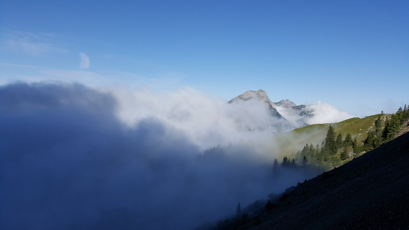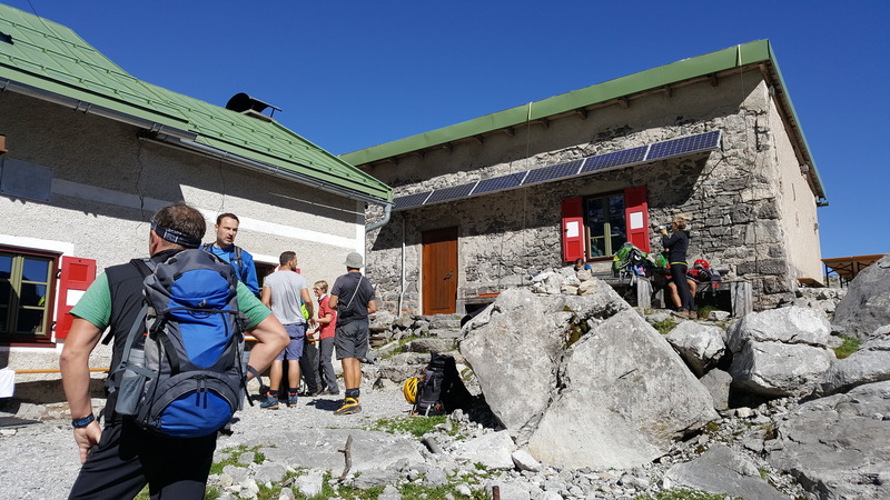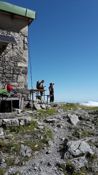 Es war kaum zu glauben, aber an diesem Montagmorgen waren die Regenwolken verschwunden, nur ein weißes Dunstkleid hüllte teilweise das Tal und natürlich unser heutiges Ziel, die Zugspitze ein. Trotzdem konnten wir in den Wolkenlücken erkennen, dass uns heute, wie auch schon vorhergesagt, ein Kaiserwetter erwarten würde. Deshalb hatten wir uns auch schon früh in Schale geworfen und fuhren nach dem Frühstück zum Campingplatz Dr. Lauth, wo wir unser Auto abstellten und zuerst zur Gamsalm 1.256 m wanderten. Von dort aus ging es dann richtig in die Vollen, die Steigung dürfte mal locker über 20 % gelegen haben und unsere Gruppe hörte sich an wie ein altes Dampflok-Treffen. Zudem brannte unsere Muskulatur in den Oberschenkeln, so dass wir erstmal das Tempo rausnahmen, um Körner zu sparen, denn schließlich standen ja noch 1700 Höhenmeter auf dem Programm. In steilen Serpentinen ging es vorbei an den Ehrwalder Köpfen immer höher hinauf, bis wir aus der Dunstglocke in die Sonne traten und auf der anderen Seite den Eibsee sehen konnten. Diese Licht- und Schattenbilder, gepaart mit den Felsen des Wettersteins und der umliegenden Berge, die ihre Köpfe aus einem Wolkenmeer streckten, machten schon des Beginn des noch jungen Tages zu einem unvergesslichen Erlebnis. Nach gut 2,5 Stunden und den ersten leichten Kletterpassagen erreichten wir die Wiener-Neustädter-Hütte 2.209 m, wo wir bei einer Johannisbeerschorle auf unsere Nachzügler Charly und Jürgen warteten. Rund 1100 Höhenmeter hatten wir jetzt schon hinter uns und der schönste Teil im Fels sollte ja jetzt noch kommen. Den letzten steilen Anstieg im Schotter brachten wir dann locker über die Bühne, nur Jürgen und Charly verloren den Anschluss, so dass wir zu Dritt den Einstieg des Klettersteiges angingen. In leichter Kletterei ging es zum Stopselzieher, der sich als kleiner offener Stollen präsentierte. Danach wechselten sich Bänder mit längeren Gehpassagen und leichten Kletterstellen ab. Kurz vor dem Ausstieg zog sich der „Alte Mann“ noch eine Muskelverhärtung in der rechten Wade zu und erreichte humpelnd den Gipfelgrat. Während „Don Pedro“ mit Hilfe von Uwä noch einen Cache suchte, schleppte sich, im wahrsten Sinne des Wortes, unser Oldie vorbei am Grenzschild zwischen Bayern und Österreich auf dem Grat zum Münchner Haus. Also nix aufi zum Gipfel über den Grat, sondern einreihen in die Schlange, die über das Münchner Haus zum Gipfel wollte. Oben angekommen, zeigte sich uns ein Bild des Grauens, denn hier oben war die Hölle los. Menschenmassen warteten mehr oder weniger geduldig bis sie zum Gipfel hinüber durften, davon waren die meisten mit der Zugspitzbahn von Ehrwald herauf gekommen. In Sommerkleidung ging es dann, teilweise auf allen Vieren kriechend, einspurig auf dem Grat in Richtung Gipfel. Da verging uns zum ersten Male die Lust auf ein Fotoshooting am Gipfelkreuz, aber wir mussten ja noch auf unsere Nachzügler warten. So schauten wir noch ein bisschen den Bauarbeitern der neuen Bahn vom Eibsee zu, die über dem Abgrund waghalsige Kletterkünste zeigten. Zur großen Überraschung, liefen uns noch Nadja und Nashjm über den Weg und uns wurde wieder einmal klar, wie klein die Welt doch war. Nach gefühlter, endloser Wartezeit kamen dann auch Jürgen und Charly oben an und nachdem wir unser Peterle von seiner Cache-Sucht im Museum des Münchner Hauses befreit hatten, konnte es endlich gen Ehrwalder Talstation gehen. Dort machten wir noch den vorher schon geplanten Abstecher über die Gamsalm, wo wir den schönsten Tag der Woche ausklingen ließen.